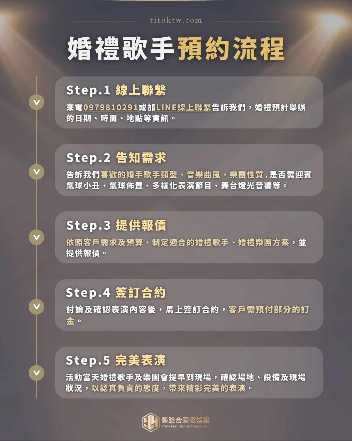 婚禮歌手推薦找台北藝路合國際娛樂,預約流程很簡單,只要以下幾個步驟: